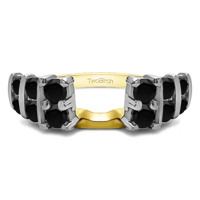 This ring wrap has 12 stones in total. It features a mix of round and round prong set stones with a total combined weight of 0.25 carats. It has a total width of 2 millimeters and has three rows of stones, bar set, and finished with a traditional high polish. This ring wrap is made to fit a round solitaire from 0.5 carat up to 1 carat, or a marquise solitaire from 0.25 carat up to 0.5 carat, or a princess solitaire from 0.5 carat up to 1 carat.