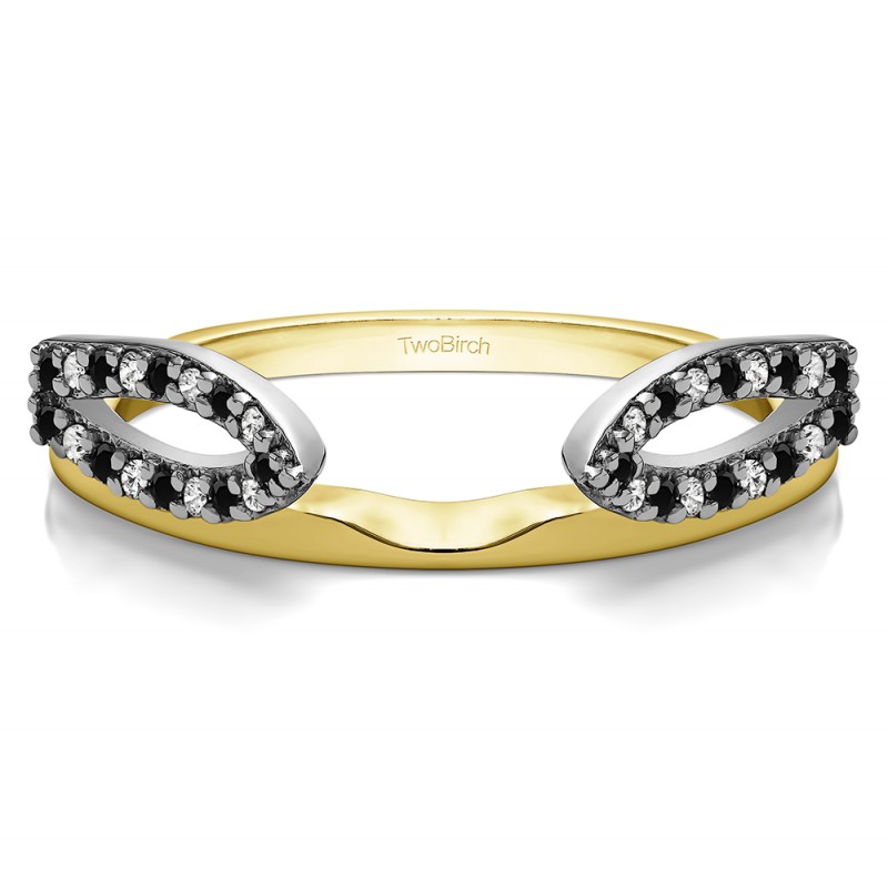 This ring wrap has 34 round, prong set stones with a total combined weight of 0.25 carats. It has a total width of 1.8 millimeters and is specifically designed to fit with a cathedral style engagement ring. This ring wrap is made to fit a round solitaire from 0.75 carat up to 1.25 carat, or a marquise solitaire from 1 carat up to 1.5 carat, or a princess solitaire from 0.75 carat up to 1 carat.