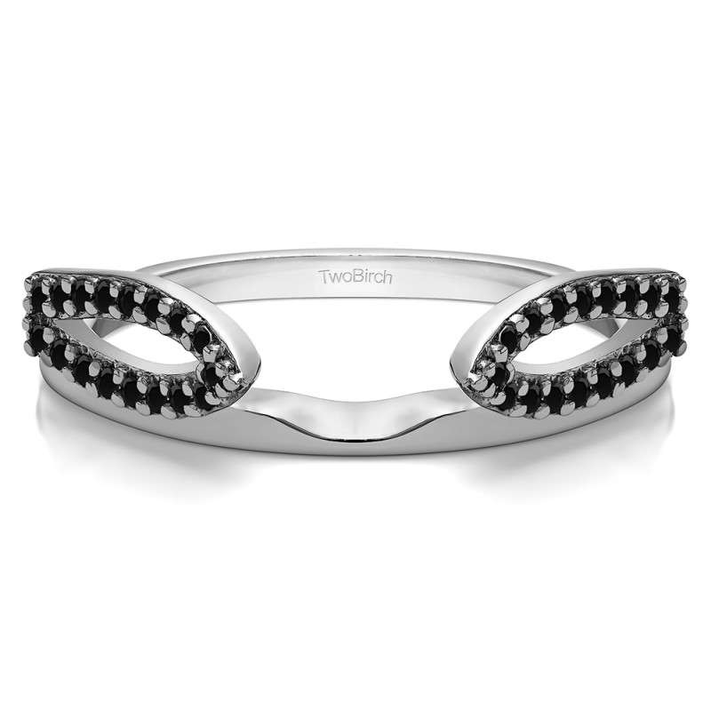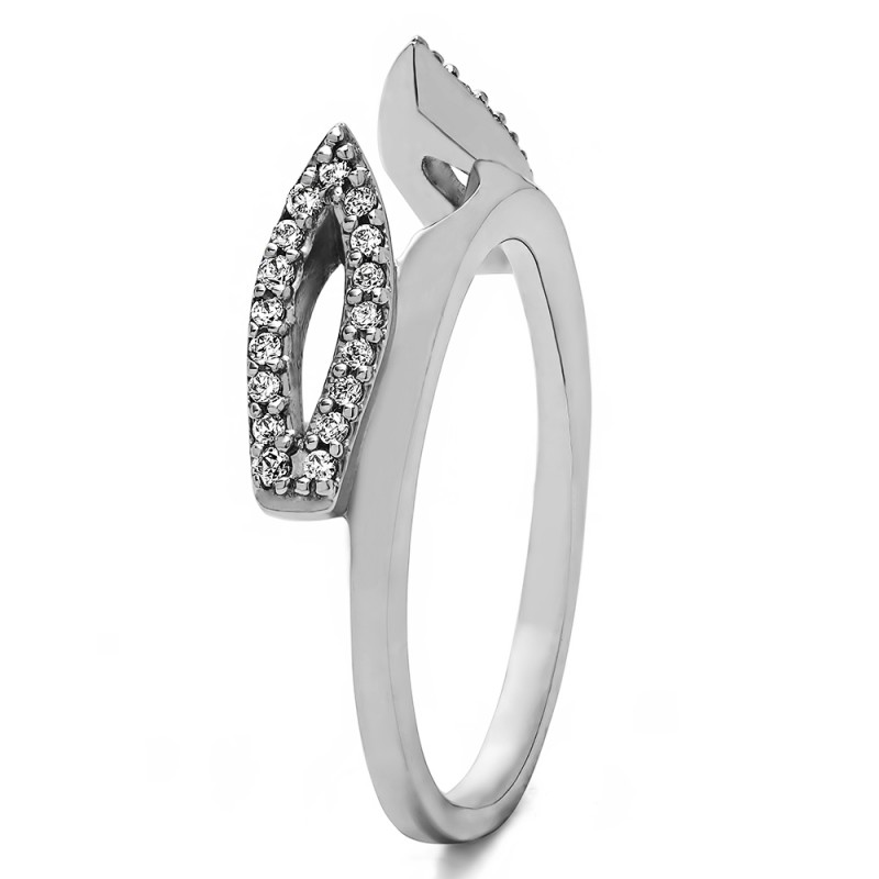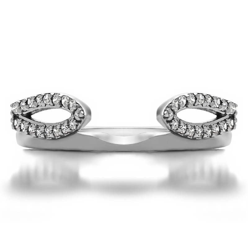 This ring wrap has 34 round, prong set stones with a total combined weight of 0.25 carats. It has a total width of 1.8 millimeters and is specifically designed to fit with a cathedral style engagement ring. This ring wrap is made to fit a round solitaire from 0.75 carat up to 1.25 carat, or a marquise solitaire from 1 carat up to 1.5 carat, or a princess solitaire from 0.75 carat up to 1 carat.