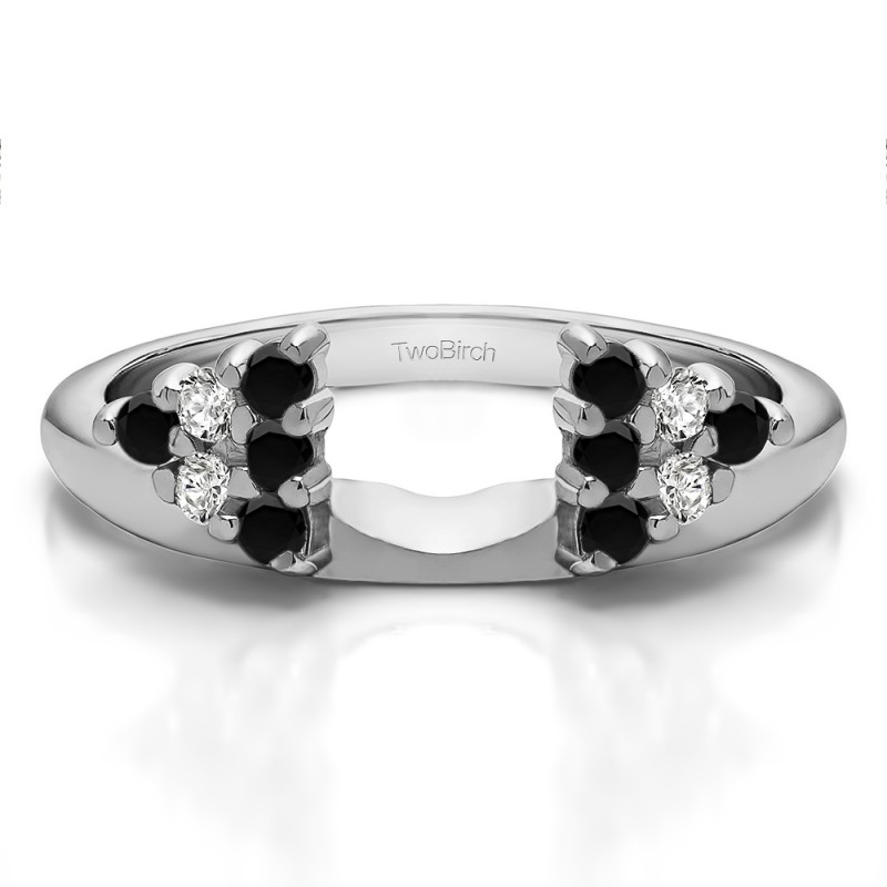This ring wrap has 12 round, prong set stones with a total combined weight of 0.25 carats. It has a total width of 1.6 millimeters. The stones in this wrap enhance are set in two clusters, on each side of the center, making it appear as a three stone ring when added onto your solitaire. This ring wrap is made to fit a round solitaire from 0.5 carat up to 1 carat, or a marquise solitaire from 0.5 carat up to 0.75 carat, or a princess solitaire from 0.5 carat up to 1 carat.