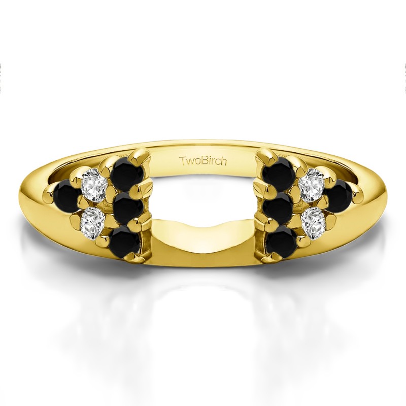 This ring wrap has 12 round, prong set stones with a total combined weight of 0.25 carats. It has a total width of 1.6 millimeters. The stones in this wrap enhance are set in two clusters, on each side of the center, making it appear as a three stone ring when added onto your solitaire. This ring wrap is made to fit a round solitaire from 0.5 carat up to 1 carat, or a marquise solitaire from 0.5 carat up to 0.75 carat, or a princess solitaire from 0.5 carat up to 1 carat.