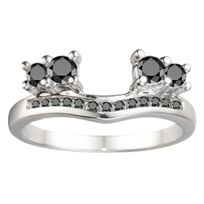 This ring wrap has 17 stones in total. It features a mix of round and round prong set stones with a total combined weight of 0.34 carats. It has a total width of 2 millimeters and features a row of round channel set stones on the band and four round prong set stones. Once you add your solitaire, it will create the look of an engagement ring with a matching channel set band. This ring wrap is made to fit a round solitaire from 0.3 carat up to 2 carat, or a marquise solitaire from 0.25 carat up to 0.5 carat, or a princess solitaire from 0.25 carat up to 0.5 carat.