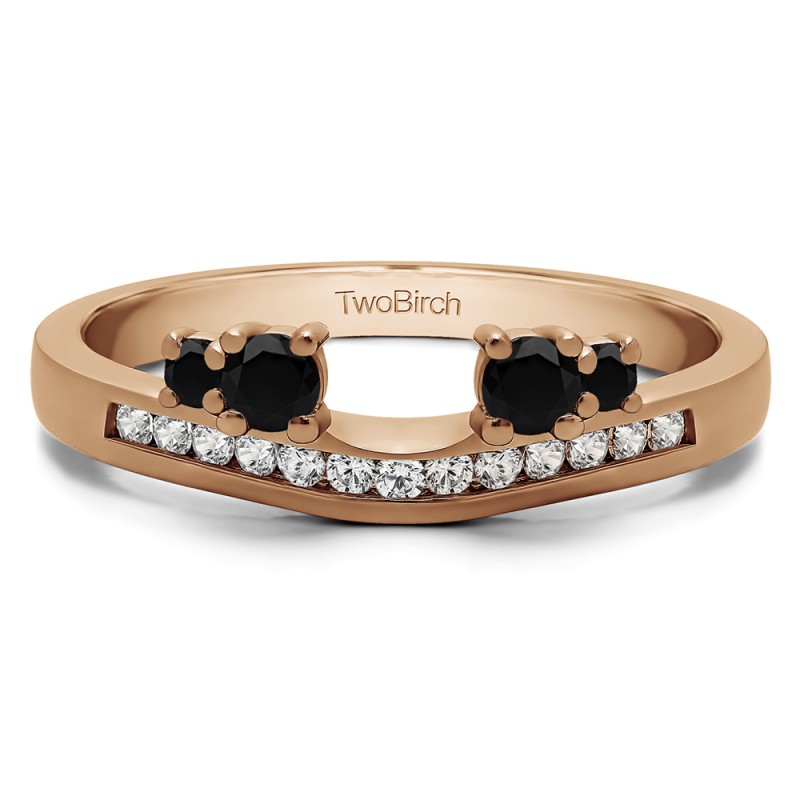 This ring wrap has 19 stones in total. It features a mix of round and round prong set stones with a total combined weight of 0.41 carats. It has a total width of 2 millimeters and features a row of round channel set stones on the band and four round prong set stones. Once you add your solitaire, it will create the look of an engagement ring with a matching channel set band. This ring wrap is made to fit a round solitaire from 0.2 carat up to 0.5 carat, or a marquise solitaire from 0.25 carat up to 0.5 carat, or a princess solitaire from 0.2 carat up to 0.45 carat.