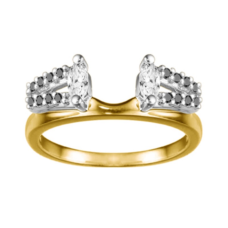 This ring wrap has 18 stones in total. It features a mix of round and marquise prong set stones with a total combined weight of 0.41 carats. It has a total width of 2 millimeters and has a double row of stones with a marquise stone on the top. This ring wrap is made to fit a round solitaire from 0.25 carat up to 1 carat, or a marquise solitaire from 0.25 carat up to 0.5 carat, or a princess solitaire from 0.3 carat up to 1 carat.