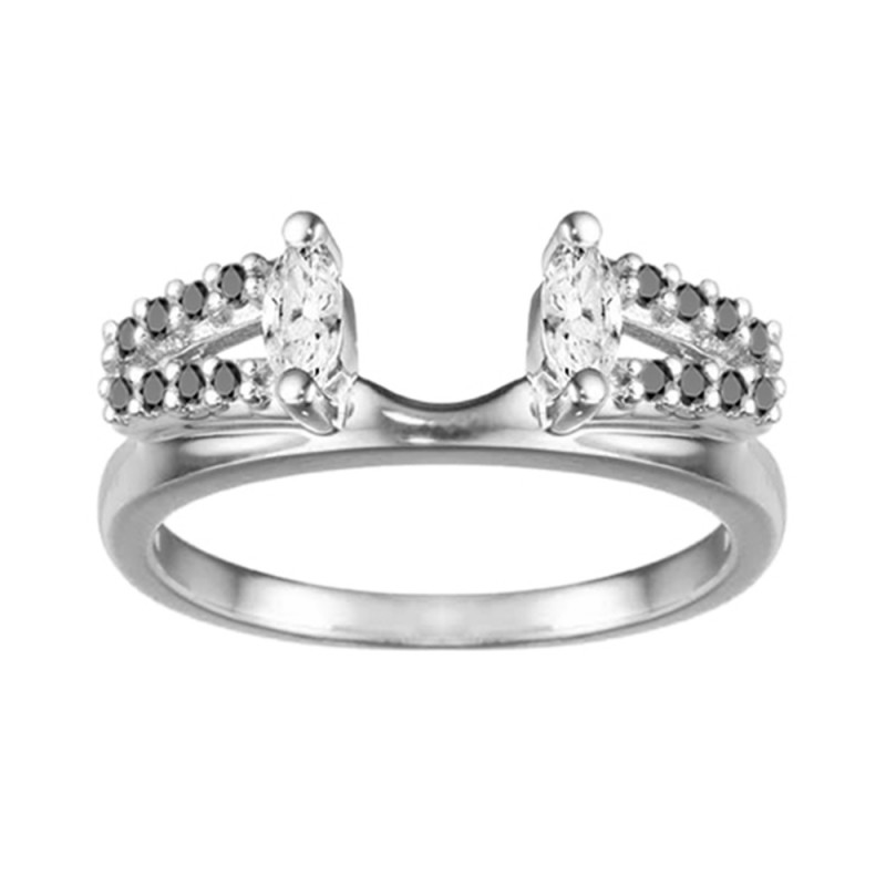 This ring wrap has 18 stones in total. It features a mix of round and marquise prong set stones with a total combined weight of 0.41 carats. It has a total width of 2 millimeters and has a double row of stones with a marquise stone on the top. This ring wrap is made to fit a round solitaire from 0.25 carat up to 1 carat, or a marquise solitaire from 0.25 carat up to 0.5 carat, or a princess solitaire from 0.3 carat up to 1 carat.