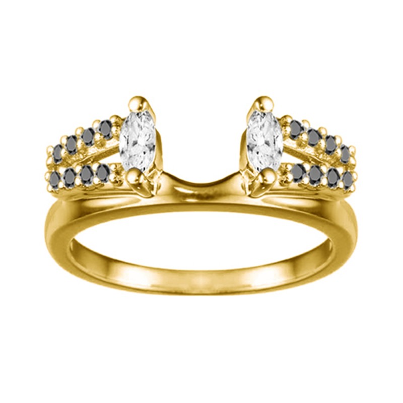 This ring wrap has 18 stones in total. It features a mix of round and marquise prong set stones with a total combined weight of 0.41 carats. It has a total width of 2 millimeters and has a double row of stones with a marquise stone on the top. This ring wrap is made to fit a round solitaire from 0.25 carat up to 1 carat, or a marquise solitaire from 0.25 carat up to 0.5 carat, or a princess solitaire from 0.3 carat up to 1 carat.