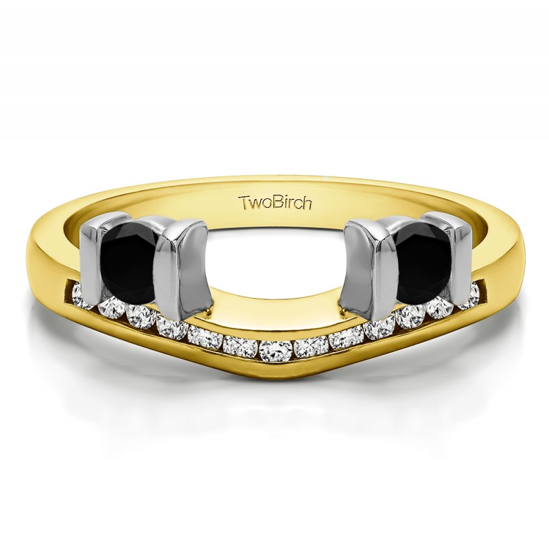 This ring wrap has 15 stones in total. It features a mix of round and round bar set stones with a total combined weight of 0.42 carats. It has a total width of 2.5 millimeters and features a row of channel set stones on the band and two bar set stones. Once you add your solitaire, it will create the look of a three stone engagement ring with a matching channel set band. This ring wrap is made to fit a round solitaire from 0.25 carat up to 1 carat, or a marquise solitaire from 0.25 carat up to 0.5 carat, or a princess solitaire from 0.3 carat up to 1 carat.