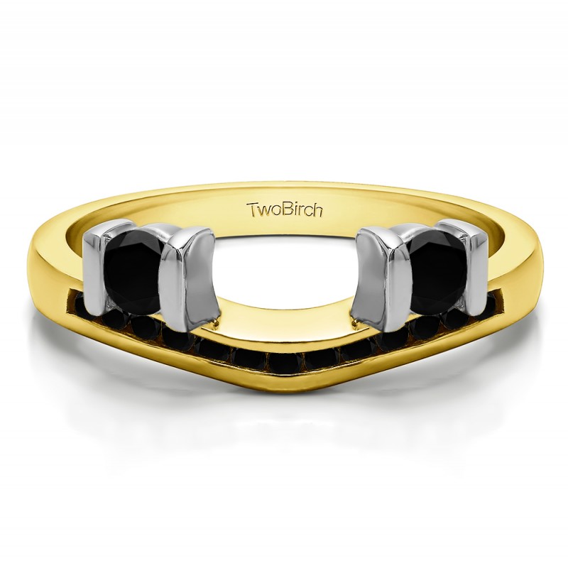 This ring wrap has 15 stones in total. It features a mix of round and round bar set stones with a total combined weight of 0.42 carats. It has a total width of 2.5 millimeters and features a row of channel set stones on the band and two bar set stones. Once you add your solitaire, it will create the look of a three stone engagement ring with a matching channel set band. This ring wrap is made to fit a round solitaire from 0.25 carat up to 1 carat, or a marquise solitaire from 0.25 carat up to 0.5 carat, or a princess solitaire from 0.3 carat up to 1 carat.