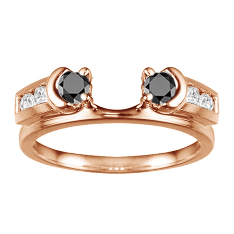 This ring wrap has 6 stones in total. It features a mix of round and round prong set stones with a total combined weight of 0.48 carats. It has a total width of 2 millimeters. Round stones are set in a unique half bezel, giving the ring wrap the appearance of a half-moon on each side of the center. This ring wrap is made to fit a round solitaire from 0.5 carat up to 0.75 carat, or a marquise solitaire from 0.25 carat up to 0.5 carat, or a princess solitaire from 0.5 carat up to 0.75 carat.