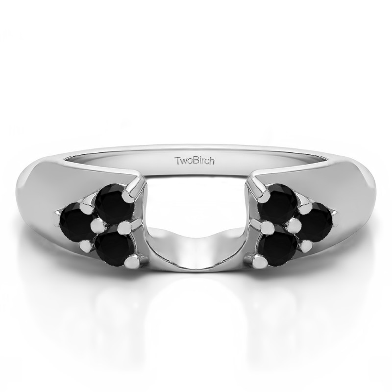 This ring wrap has 6 round, prong set stones with a total combined weight of 0.48 carats. It has a total width of 2 millimeters and has two clusters of round stones. This ring wrap is made to fit a round solitaire from 0.25 carat up to 1 carat, or a marquise solitaire from 0.25 carat up to 0.5 carat, or a princess solitaire from 0.3 carat up to 1 carat.