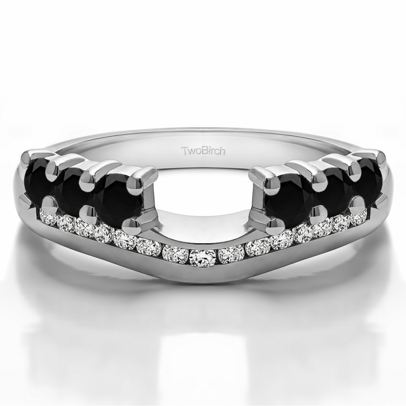 This ring wrap has 21 stones in total. It features a mix of round and round prong set stones with a total combined weight of 0.49 carats. It has a total width of 2 millimeters and features a row of round channel set stones on the band and six round prong set stones. Once you add your solitaire, it will create the look of an engagement ring with a matching channel set band. This ring wrap is made to fit a round solitaire from 0.25 carat up to 1 carat, or a marquise solitaire from 0.25 carat up to 0.5 carat, or a princess solitaire from 0.3 carat up to 1 carat.
