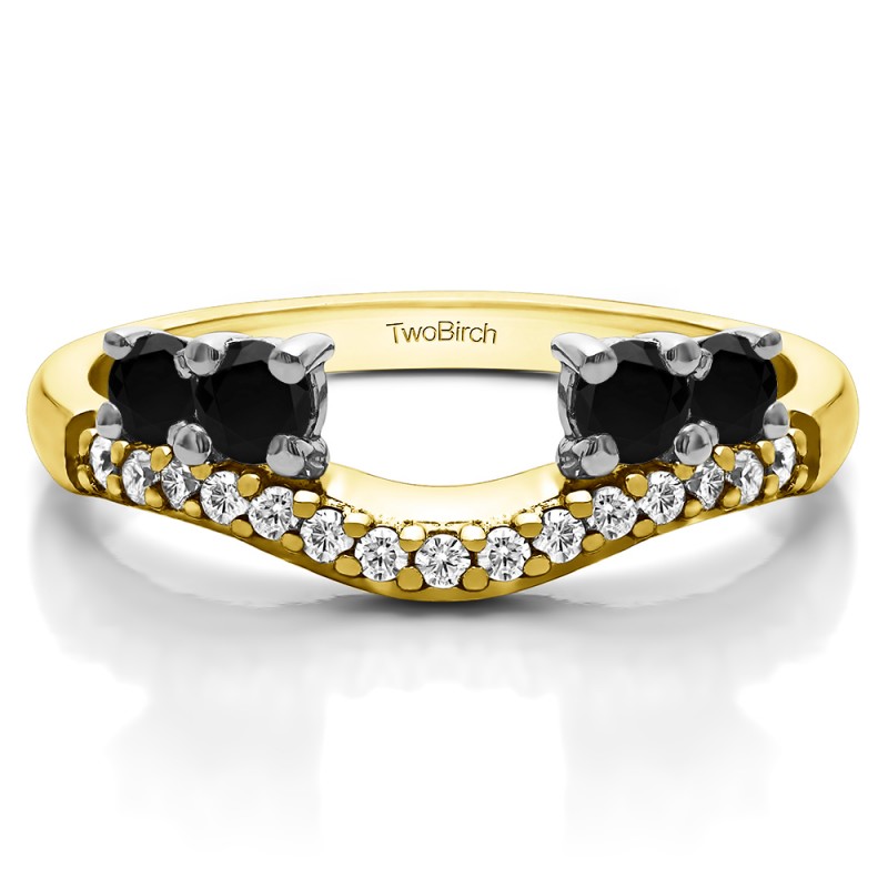 This ring wrap has 19 round, prong set stones with a total combined weight of 0.49 carats. It has a total width of 2 millimeters and features a contoured band with shared progs and four graduated stones, prong set. When combined with a solitaire, it created a perfectly matched bridal set consisting of curved ring and engagement ring. This ring wrap is made to fit a round solitaire from 0.25 carat up to 1 carat, or a marquise solitaire from 0.25 carat up to 0.5 carat, or a princess solitaire from 0.3 carat up to 1 carat.