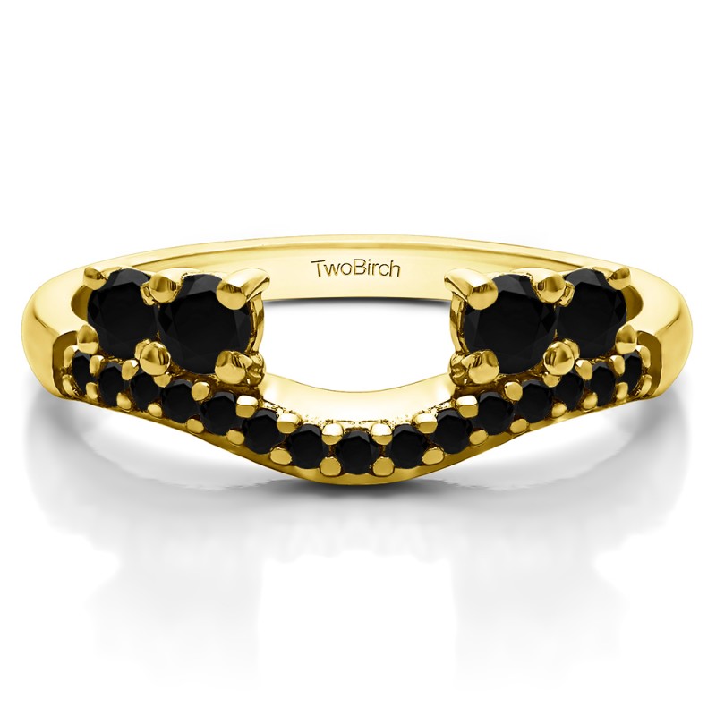 This ring wrap has 19 round, prong set stones with a total combined weight of 0.49 carats. It has a total width of 2 millimeters and features a contoured band with shared progs and four graduated stones, prong set. When combined with a solitaire, it created a perfectly matched bridal set consisting of curved ring and engagement ring. This ring wrap is made to fit a round solitaire from 0.25 carat up to 1 carat, or a marquise solitaire from 0.25 carat up to 0.5 carat, or a princess solitaire from 0.3 carat up to 1 carat.