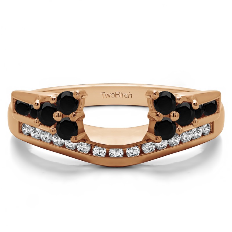 This ring wrap has 25 stones in total. It features a mix of round and round prong set stones with a total combined weight of 0.5 carats. It has a total width of 2 millimeters and features a channel set row of stones on the band, with a cluster of round stones surrounding the center stone, once you add your solitaire. This ring wrap is made to fit a round solitaire from 0.25 carat up to 1 carat, or a marquise solitaire from 0.25 carat up to 0.5 carat, or a princess solitaire from 0.3 carat up to 1 carat.