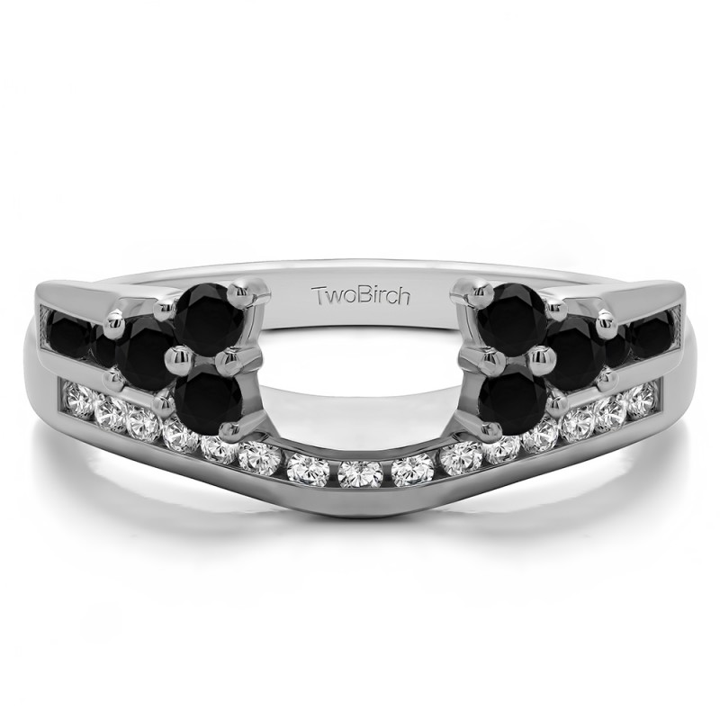 This ring wrap has 25 stones in total. It features a mix of round and round prong set stones with a total combined weight of 0.5 carats. It has a total width of 2 millimeters and features a channel set row of stones on the band, with a cluster of round stones surrounding the center stone, once you add your solitaire. This ring wrap is made to fit a round solitaire from 0.25 carat up to 1 carat, or a marquise solitaire from 0.25 carat up to 0.5 carat, or a princess solitaire from 0.3 carat up to 1 carat.