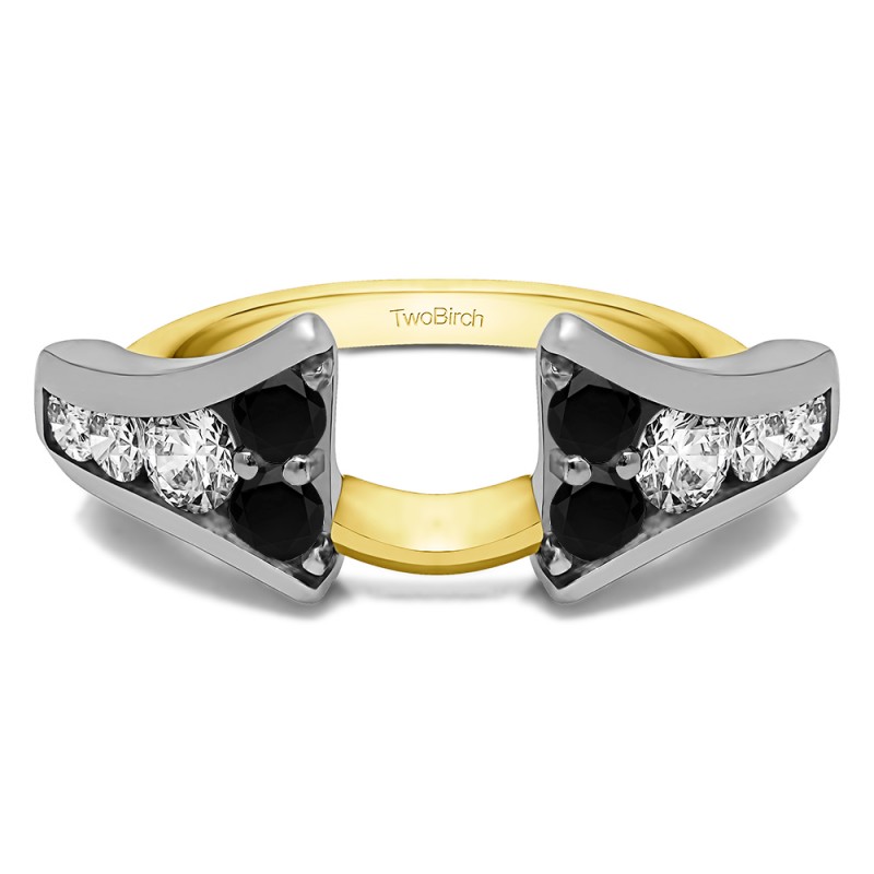 This ring wrap has 10 round, channel set stones with a total combined weight of 0.5 carats. It has a total width of 2.2 millimeters and has a unique Y shape with stones that lead up to the center. This ring wrap is made to fit a round solitaire from 0.25 carat up to 1 carat, or a marquise solitaire from 0.25 carat up to 0.5 carat, or a princess solitaire from 0.3 carat up to 1 carat.