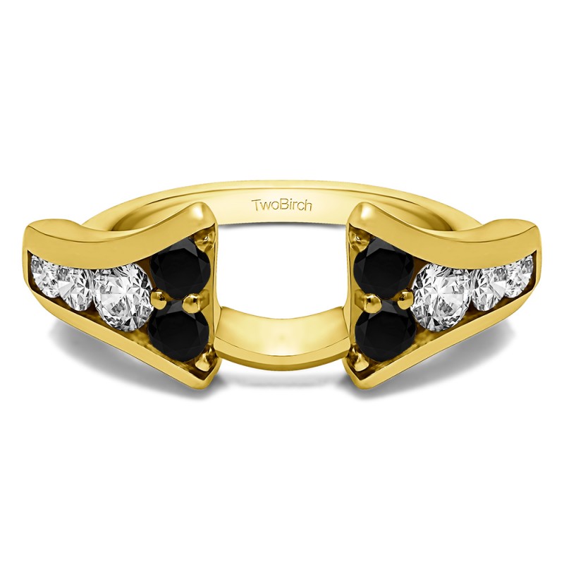 This ring wrap has 10 round, channel set stones with a total combined weight of 0.5 carats. It has a total width of 2.2 millimeters and has a unique Y shape with stones that lead up to the center. This ring wrap is made to fit a round solitaire from 0.25 carat up to 1 carat, or a marquise solitaire from 0.25 carat up to 0.5 carat, or a princess solitaire from 0.3 carat up to 1 carat.