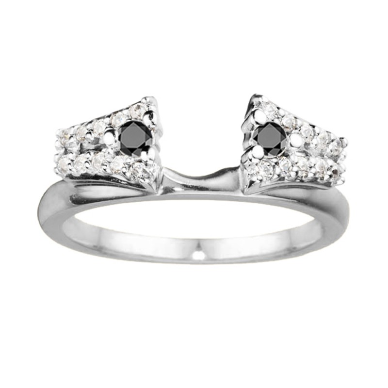 This ring wrap has 22 round, prong set stones with a total combined weight of 0.5 carats. It has a total width of 2 millimeters and has a double row of shared prong set stones with one larger one at the top, near the center. This ring wrap is made to fit a round solitaire from 0.25 carat up to 1 carat, or a marquise solitaire from 0.25 carat up to 0.5 carat, or a princess solitaire from 0.3 carat up to 1 carat.