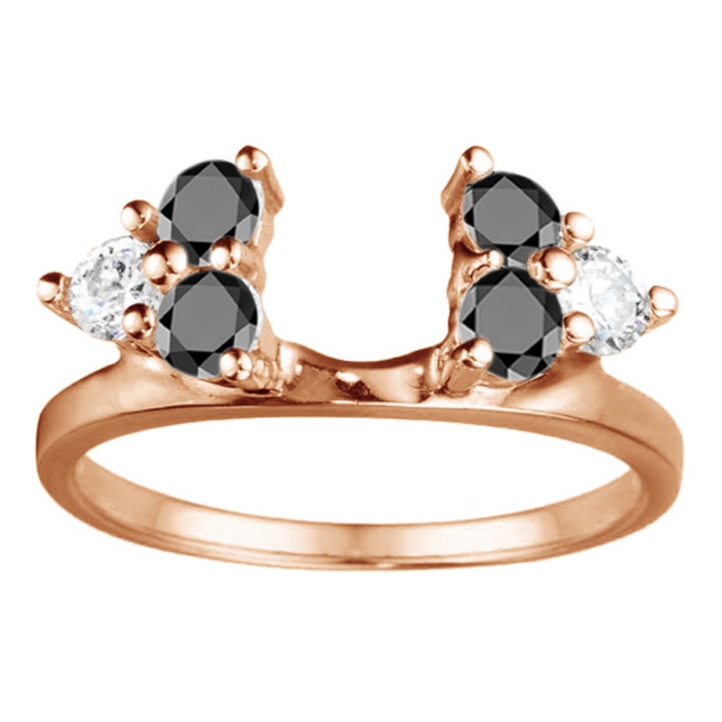 This ring wrap has 6 round, prong set stones with a total combined weight of 0.5 carats. It has a total width of 2 millimeters and has two, shared prong sections of round stones. It features a 'three stone' look by using two small clusters on each side of the center. This ring wrap is made to fit a round solitaire from 0.25 carat up to 1 carat, or a marquise solitaire from 0.25 carat up to 0.5 carat, or a princess solitaire from 0.3 carat up to 1 carat.