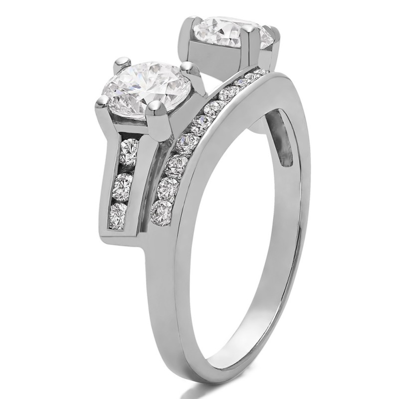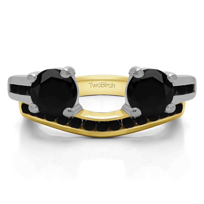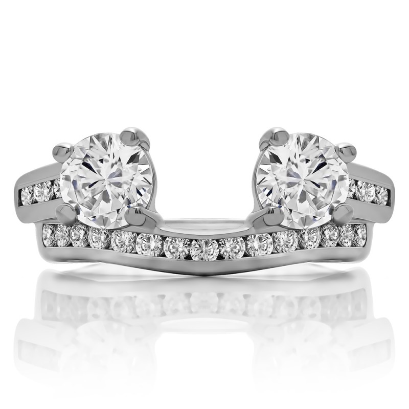 This ring wrap has 23 stones in total. It features a mix of round and round prong set stones with a total combined weight of 0.75 carats. It has a total width of 2 millimeters and features a row of channel set stones on the band and two prong set stones with channel set round accent stones. Once you add your solitaire, it will create the look of an accented three stone engagement ring with a matching channel set band. This ring wrap is made to fit a round solitaire from 0.25 carat up to 1 carat, or a marquise solitaire from 0.25 carat up to 0.5 carat, or a princess solitaire from 0.3 carat up to 1 carat.