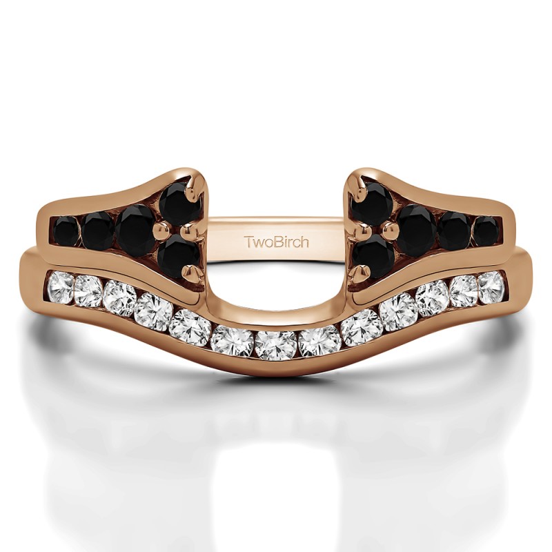 This ring wrap has 23 round, channel set stones with a total combined weight of 0.76 carats. It has a total width of 2.5 millimeters and features a row of round channel set stones on the band and a cluster of round stones that adorn the center opening. Once you add your solitaire, it will create the look of an engagement ring with a matching channel set band. This ring wrap is made to fit a round solitaire from 0.25 carat up to 1 carat, or a marquise solitaire from 0.25 carat up to 0.5 carat, or a princess solitaire from 0.3 carat up to 1 carat.