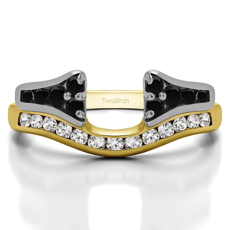 This ring wrap has 23 round, channel set stones with a total combined weight of 0.76 carats. It has a total width of 2.5 millimeters and features a row of round channel set stones on the band and a cluster of round stones that adorn the center opening. Once you add your solitaire, it will create the look of an engagement ring with a matching channel set band. This ring wrap is made to fit a round solitaire from 0.25 carat up to 1 carat, or a marquise solitaire from 0.25 carat up to 0.5 carat, or a princess solitaire from 0.3 carat up to 1 carat.