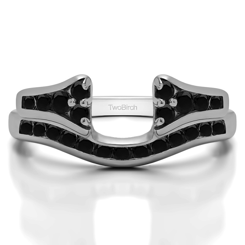 This ring wrap has 23 round, channel set stones with a total combined weight of 0.76 carats. It has a total width of 2.5 millimeters and features a row of round channel set stones on the band and a cluster of round stones that adorn the center opening. Once you add your solitaire, it will create the look of an engagement ring with a matching channel set band. This ring wrap is made to fit a round solitaire from 0.25 carat up to 1 carat, or a marquise solitaire from 0.25 carat up to 0.5 carat, or a princess solitaire from 0.3 carat up to 1 carat.
