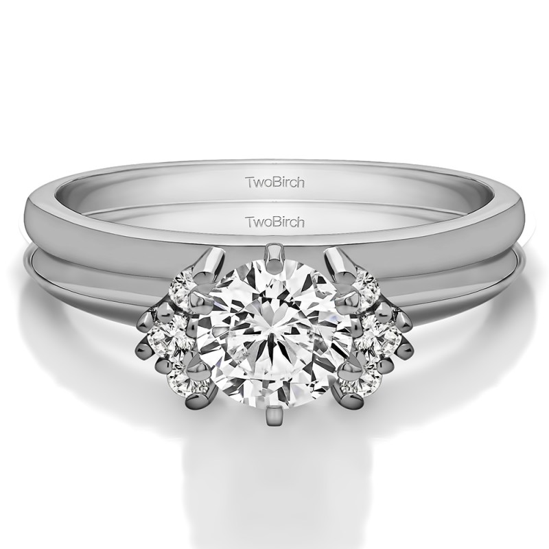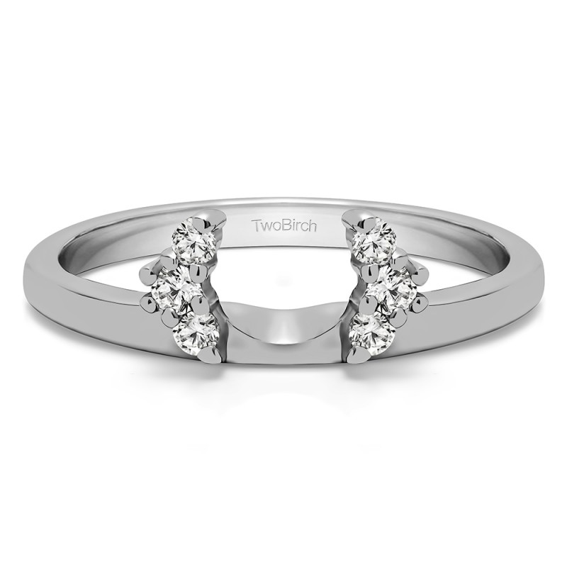 This ring wrap has 6 round, prong set stones with a total combined weight of 0.13 carats. It has a total width of 1.9 millimeters and has three stones on each side of the center that create the look of a halo engagement ring once you add your solitaire. This ring wrap is made to fit a round solitaire from 0.25 carat up to 0.75 carat, or a marquise solitaire from 0.25 carat up to 0.5 carat, or a princess solitaire from 0.5 carat up to 0.75 carat.