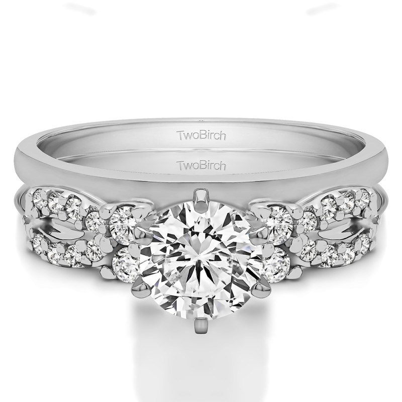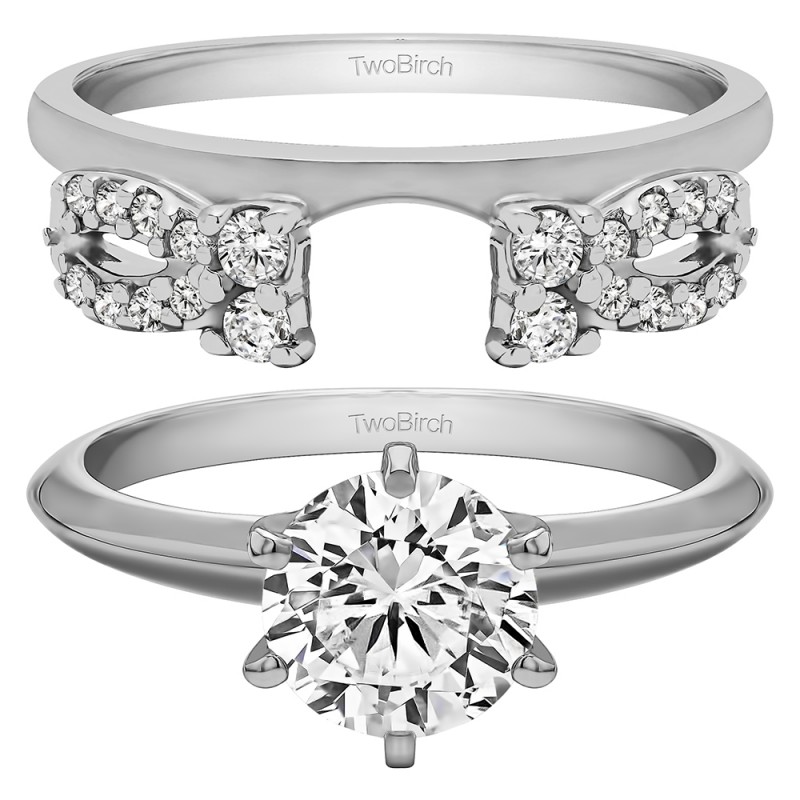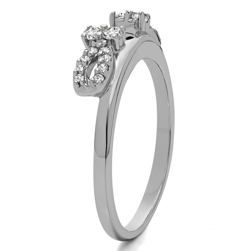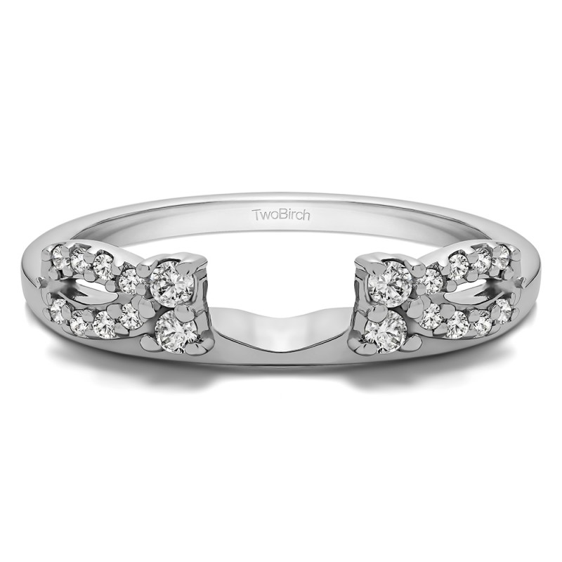 This ring wrap has 20 round, prong set stones with a total combined weight of 0.2 carats. It has a total width of 2 millimeters. The stones in this wrap are set with a cutout in the center giving it a bow shape. This ring wrap is made to fit a round solitaire from 0.25 carat up to 0.5 carat, or a marquise solitaire from 0.25 carat up to 0.5 carat, or a princess solitaire from 0.25 carat up to 0.5 carat.