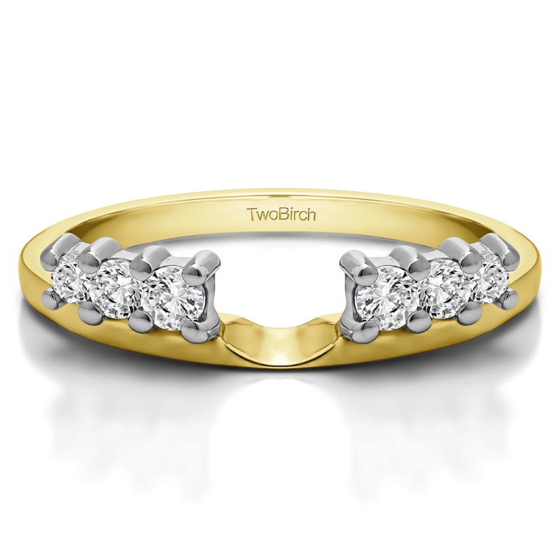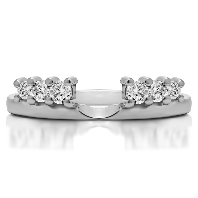 This ring wrap has 6 round, prong set stones with a total combined weight of 0.25 carats. It has a total width of 1.7 millimeters and has six stones, graduated in size. This ring wrap is made to fit a round solitaire from 0.25 carat up to 0.5 carat, or a marquise solitaire from 0.25 carat up to 0.5 carat, or a princess solitaire from 0.25 carat up to 0.5 carat.