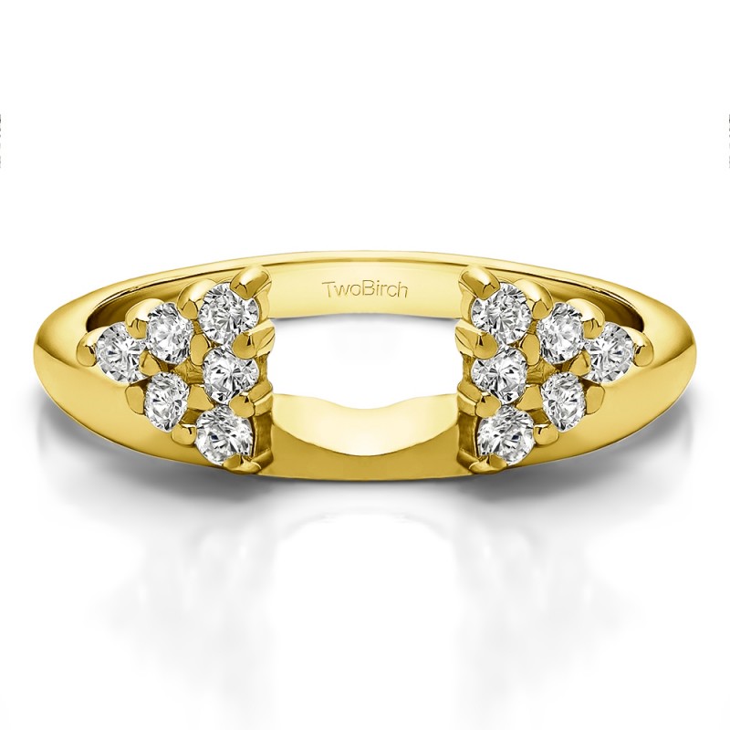 This ring wrap has 12 round, prong set stones with a total combined weight of 0.25 carats. It has a total width of 1.6 millimeters. The stones in this wrap enhance are set in two clusters, on each side of the center, making it appear as a three stone ring when added onto your solitaire. This ring wrap is made to fit a round solitaire from 0.5 carat up to 1 carat, or a marquise solitaire from 0.5 carat up to 0.75 carat, or a princess solitaire from 0.5 carat up to 1 carat.
