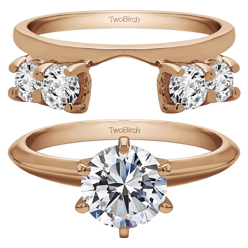 This ring wrap has 4 round, prong set stones with a total combined weight of 0.25 carats. It has a total width of 2 millimeters and has four stones, which graduate in size. This ring wrap is made to fit a round solitaire from 0.25 carat up to 1 carat, or a marquise solitaire from 0.25 carat up to 0.5 carat, or a princess solitaire from 0.25 carat up to 0.5 carat.