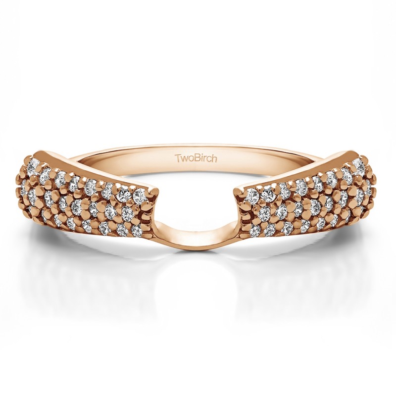 This ring wrap has 48 round, prong set stones with a total combined weight of 0.29 carats. It has a total width of 2 millimeters and features three rows of pave set stones with a stunning high polish finish. This ring wrap is made to fit a round solitaire from 0.75 carat up to 1 carat, or a marquise solitaire from 0.5 carat up to 0.75 carat, or a princess solitaire from 0.5 carat up to 1 carat.