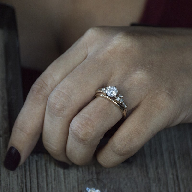 This ring wrap has 10 stones in total. It features a mix of round and round prong set stones with a total combined weight of 0.35 carats. It has a total width of 2 millimeters and has a high polish finish and a cluster of round stones. This ring wrap is made to fit a round solitaire from 0.3 carat up to 0.5 carat, or a marquise solitaire from 0.25 carat up to 0.5 carat, or a princess solitaire from 0.3 carat up to 0.5 carat.