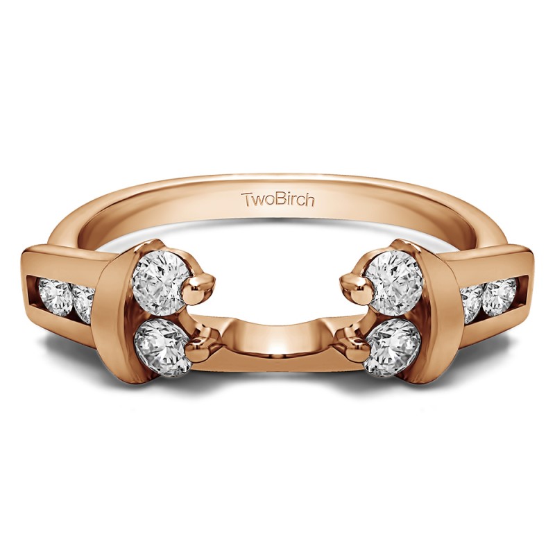 This ring wrap has 8 stones in total. It features a mix of round and round prong set stones with a total combined weight of 0.48 carats. It has a total width of 2 millimeters and has two rows of stone set in channels and prongs, perpendicular to each other. This ring wrap is made to fit a round solitaire from 0.25 carat up to 0.5 carat, or a marquise solitaire from 0.5 carat up to 0.75 carat, or a princess solitaire from 0.5 carat up to 0.75 carat.
