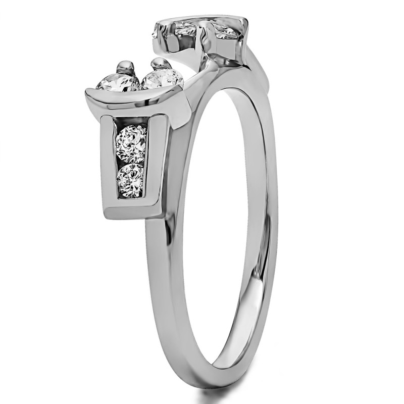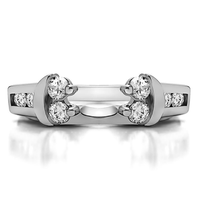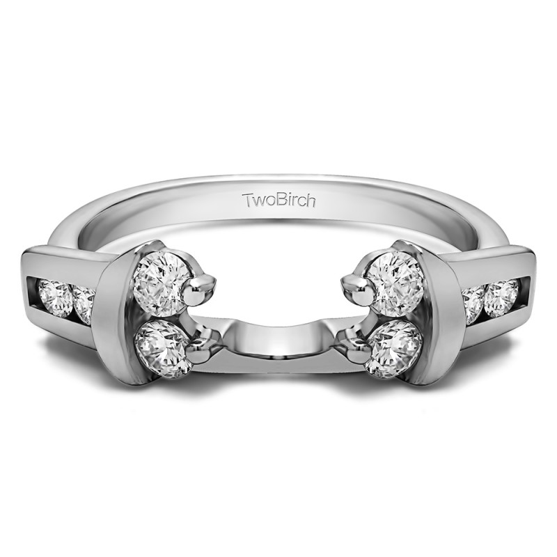This ring wrap has 8 stones in total. It features a mix of round and round prong set stones with a total combined weight of 0.48 carats. It has a total width of 2 millimeters and has two rows of stone set in channels and prongs, perpendicular to each other. This ring wrap is made to fit a round solitaire from 0.25 carat up to 0.5 carat, or a marquise solitaire from 0.5 carat up to 0.75 carat, or a princess solitaire from 0.5 carat up to 0.75 carat.