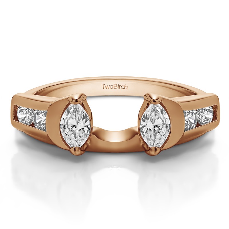This ring wrap has 6 stones in total. It features a mix of round and marquise channel set stones with a total combined weight of 0.48 carats. It has a total width of 2 millimeters and features a classic high polish finish. This ring wrap is made to fit a round solitaire from 0.25 carat up to 0.5 carat, or a marquise solitaire from 0.5 carat up to 0.75 carat, or a princess solitaire from 0.5 carat up to 0.75 carat.