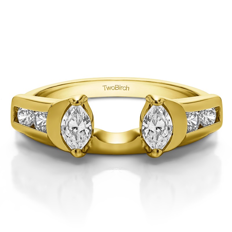 This ring wrap has 6 stones in total. It features a mix of round and marquise channel set stones with a total combined weight of 0.48 carats. It has a total width of 2 millimeters and features a classic high polish finish. This ring wrap is made to fit a round solitaire from 0.25 carat up to 0.5 carat, or a marquise solitaire from 0.5 carat up to 0.75 carat, or a princess solitaire from 0.5 carat up to 0.75 carat.