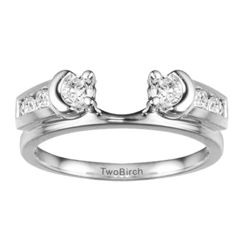 This ring wrap has 6 stones in total. It features a mix of round and round prong set stones with a total combined weight of 0.48 carats. It has a total width of 2 millimeters. Round stones are set in a unique half bezel, giving the ring wrap the appearance of a half-moon on each side of the center. This ring wrap is made to fit a round solitaire from 0.5 carat up to 0.75 carat, or a marquise solitaire from 0.25 carat up to 0.5 carat, or a princess solitaire from 0.5 carat up to 0.75 carat.