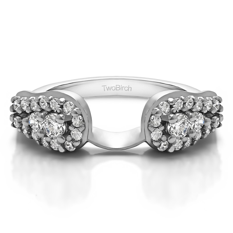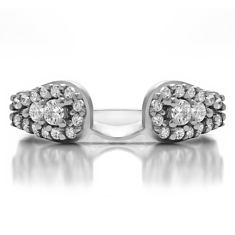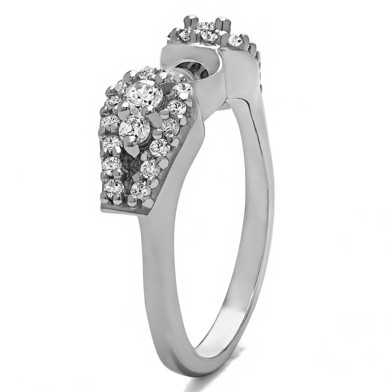 This ring wrap has 32 round, prong set stones with a total combined weight of 0.49 carats. It has a total width of 1.9 millimeters and features a stunning fishtail design with prong set stones in the center. This ring wrap is made to fit a round solitaire from 0.75 carat up to 2 carat, or a marquise solitaire from 0.25 carat up to 0.5 carat, or a princess solitaire from 0.75 carat up to 1 carat.