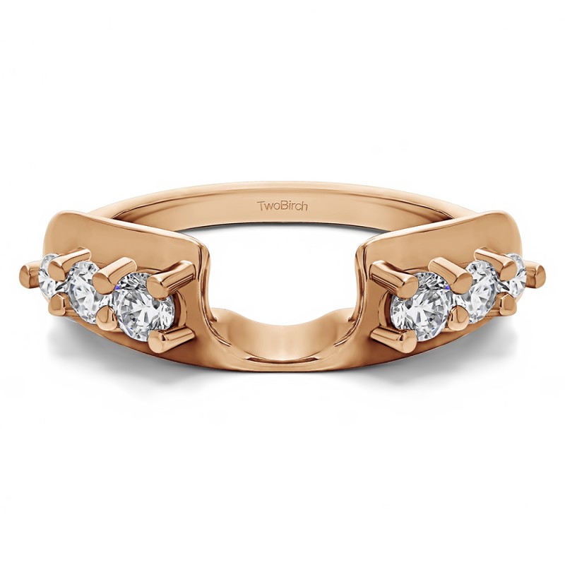 This ring wrap has 6 round, prong set stones with a total combined weight of 0.5 carats. It has a total width of 1.8 millimeters. The stones in the ring wrap jacket are graduated in size. This ring wrap is made to fit a round solitaire from 0.75 carat up to 2 carat, or a marquise solitaire from 0.25 carat up to 0.5 carat, or a princess solitaire from 0.75 carat up to 1 carat.