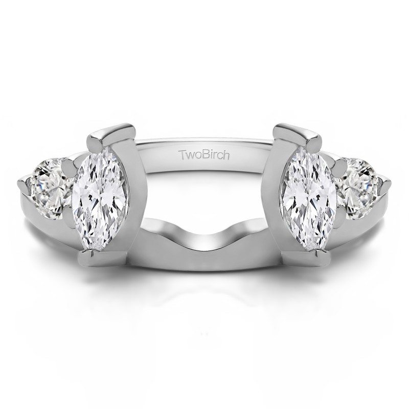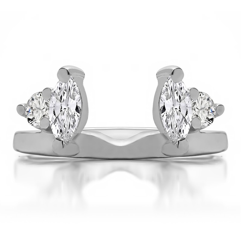 This ring wrap has 4 stones in total. It features a mix of round and marquise prong set stones with a total combined weight of 0.5 carats. It has a total width of 2 millimeters and features a stunning high polish finish. This ring wrap is made to fit a round solitaire from 0.5 carat up to 0.75 carat, or a marquise solitaire from 0.25 carat up to 0.5 carat, or a princess solitaire from 0.5 carat up to 0.75 carat.