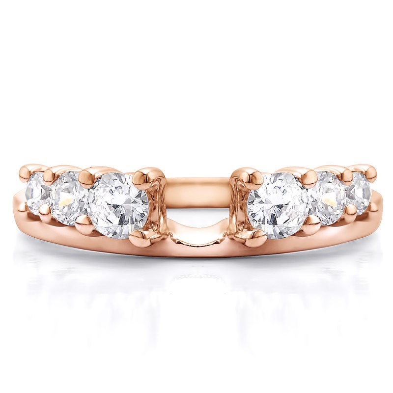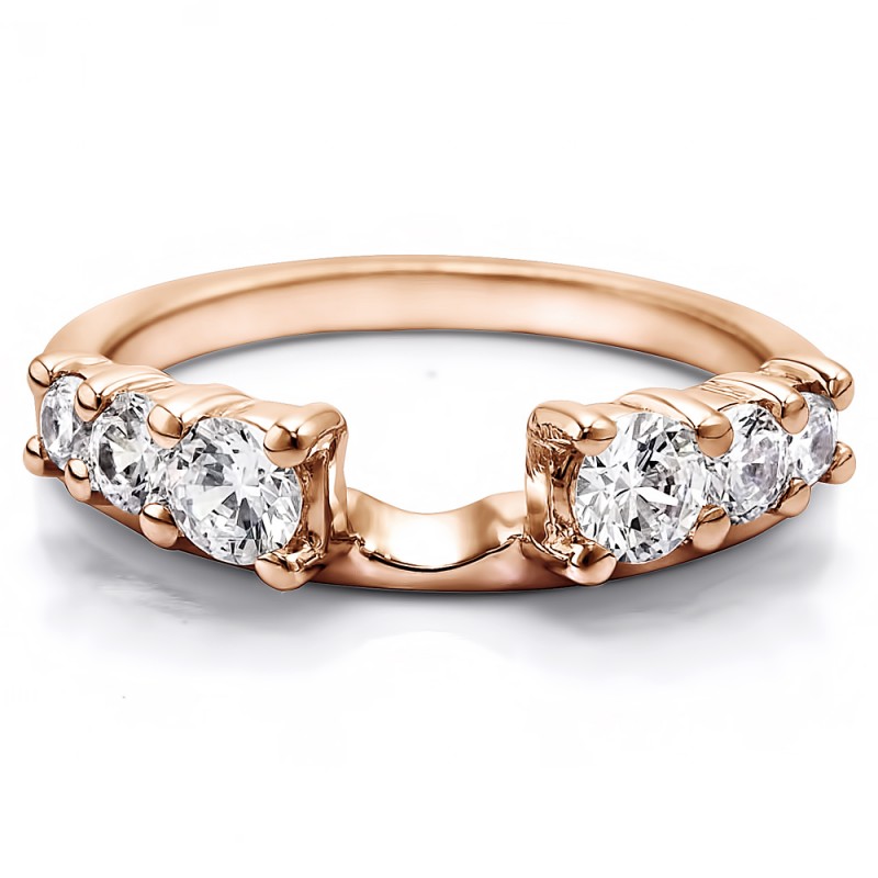 This ring wrap has 6 round, prong set stones with a total combined weight of 0.5 carats. It has a total width of 2 millimeters and has six stones, graduated in size. This ring wrap is made to fit a round solitaire from 0.25 carat up to 1.5 carat, or a marquise solitaire from 0.3 carat up to 1 carat, or a princess solitaire from 0.25 carat up to 0.5 carat.