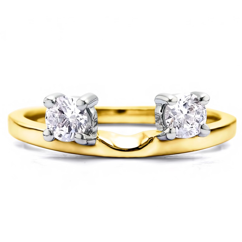 This ring wrap has 2 round, prong set stones with a total combined weight of 0.5 carats. It has a total width of 2.2 millimeters. Adding this ring wrap to your solitaire will create a three stone look. This look will work with any shape center stone. This ring wrap is made to fit a round solitaire from 0.5 carat up to 1 carat, or a marquise solitaire from 0.25 carat up to 0.5 carat, or a princess solitaire from 0.5 carat up to 1 carat.
