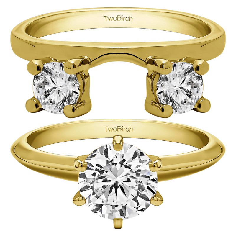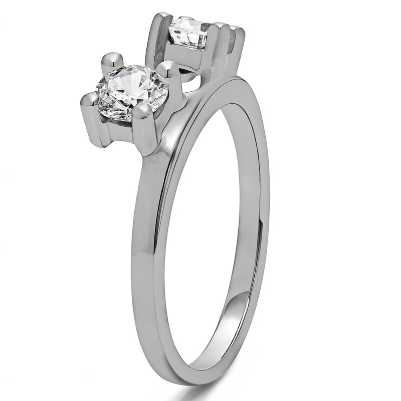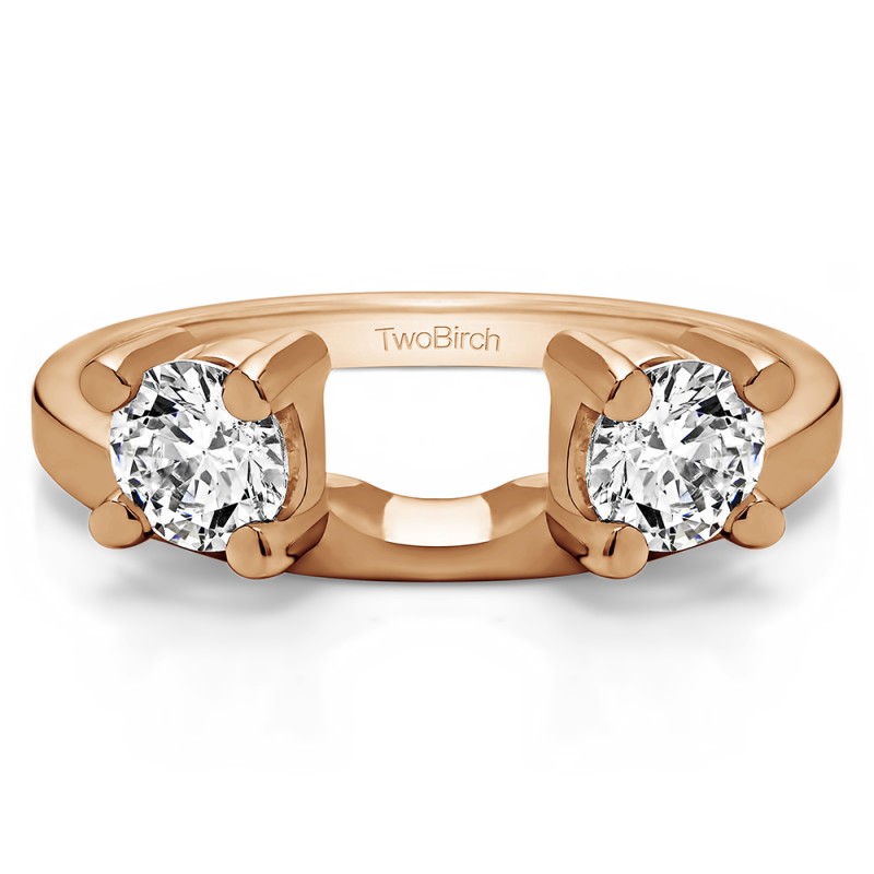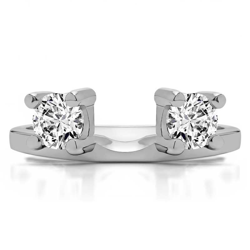 This ring wrap has 2 round, prong set stones with a total combined weight of 0.75 carats. It has a total width of 2 millimeters. Adding this ring wrap to your solitaire will create a three stone look. This look will work with any shape center stone. This ring wrap is made to fit a round solitaire from 0.45 carat up to 1.5 carat, or a marquise solitaire from 0.25 carat up to 0.5 carat, or a princess solitaire from 0.75 carat up to 1.5 carat.