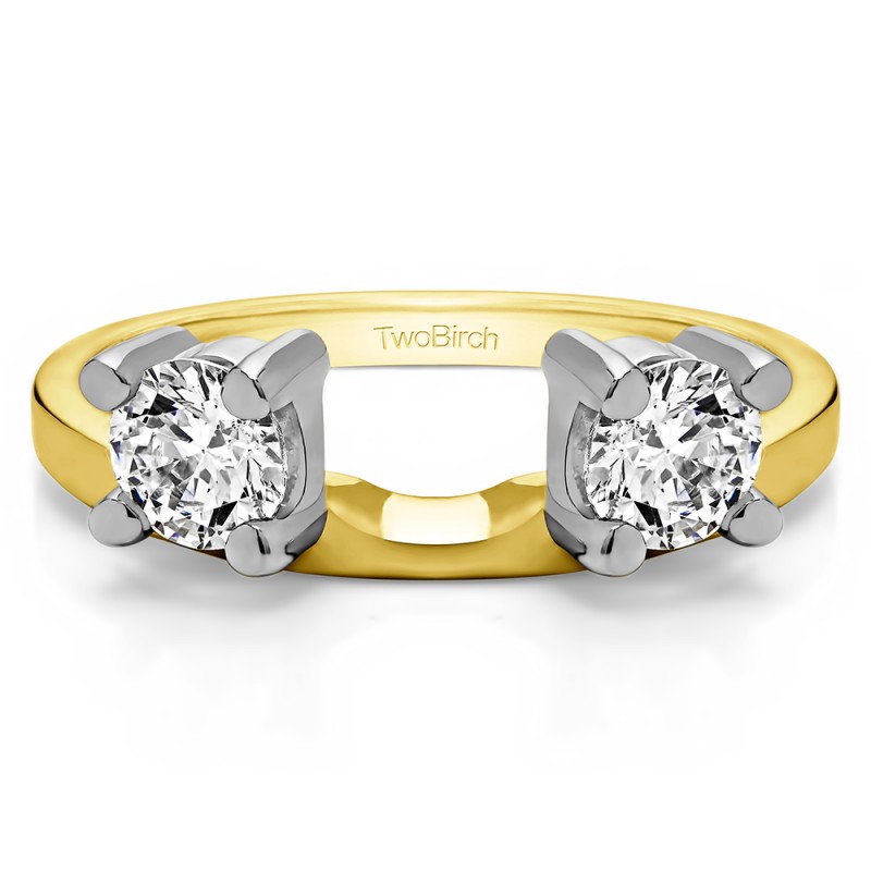 This ring wrap has 2 round, prong set stones with a total combined weight of 0.75 carats. It has a total width of 2 millimeters. Adding this ring wrap to your solitaire will create a three stone look. This look will work with any shape center stone. This ring wrap is made to fit a round solitaire from 0.45 carat up to 1.5 carat, or a marquise solitaire from 0.25 carat up to 0.5 carat, or a princess solitaire from 0.75 carat up to 1.5 carat.