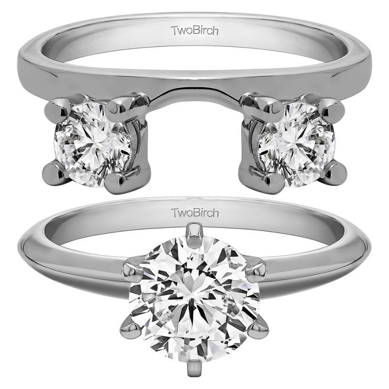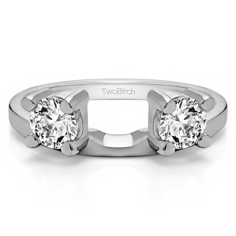 This ring wrap has 2 round, prong set stones with a total combined weight of 0.75 carats. It has a total width of 2 millimeters. Adding this ring wrap to your solitaire will create a three stone look. This look will work with any shape center stone. This ring wrap is made to fit a round solitaire from 0.45 carat up to 1.5 carat, or a marquise solitaire from 0.25 carat up to 0.5 carat, or a princess solitaire from 0.75 carat up to 1.5 carat.