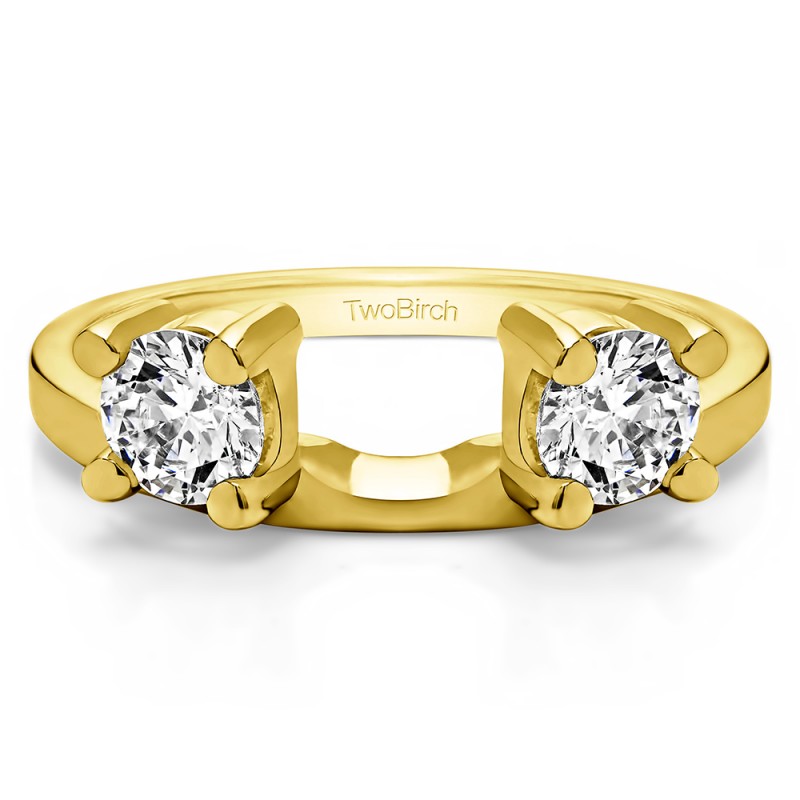 This ring wrap has 2 round, prong set stones with a total combined weight of 0.75 carats. It has a total width of 2 millimeters. Adding this ring wrap to your solitaire will create a three stone look. This look will work with any shape center stone. This ring wrap is made to fit a round solitaire from 0.45 carat up to 1.5 carat, or a marquise solitaire from 0.25 carat up to 0.5 carat, or a princess solitaire from 0.75 carat up to 1.5 carat.