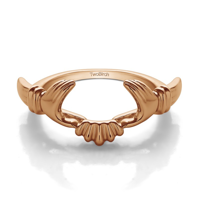 This ring wrap has 2 round, prong set stones with a total combined weight of 0 carats. It has a total width of 1.7 millimeters and has a Celtic design with the hands hugging your center stone and crown detailing. It is finished with a traditional high polish. This ring wrap is made to fit a round solitaire from 0.25 carat up to 2 carat, or a marquise solitaire from 0.25 carat up to 0.5 carat, or a princess solitaire from 0.25 carat up to 1 carat.