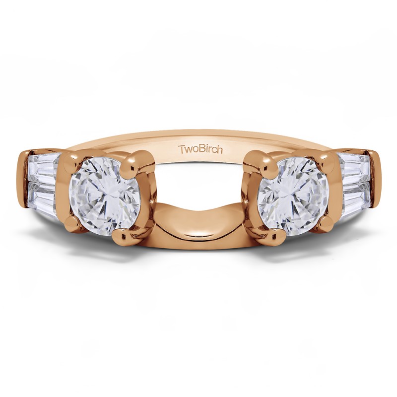This ring wrap has 6 stones in total. It features a mix of round and baguette prong set stones with a total combined weight of 1 carats. It has a total width of 2 millimeters. Tapered baguettes in this wrap are set with bars, and lead the eye to the prong set round stone on each side of the center. This ring wrap is made to fit a round solitaire from 0.5 carat up to 1.5 carat, or a marquise solitaire from 0.25 carat up to 0.5 carat, or a princess solitaire from 0.5 carat up to 1 carat.